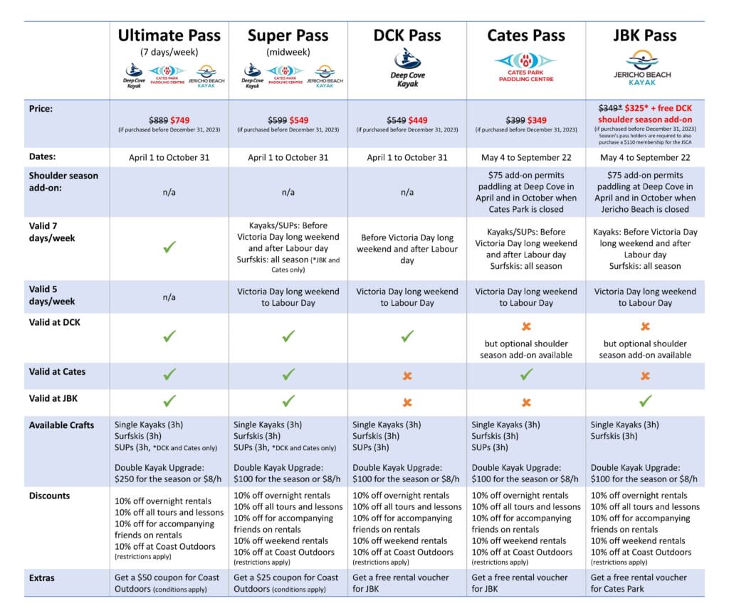 We also offer Season’s Passes for either single kayaks, double kayaks, surf skis or stand up paddleboards from $499 for the season.